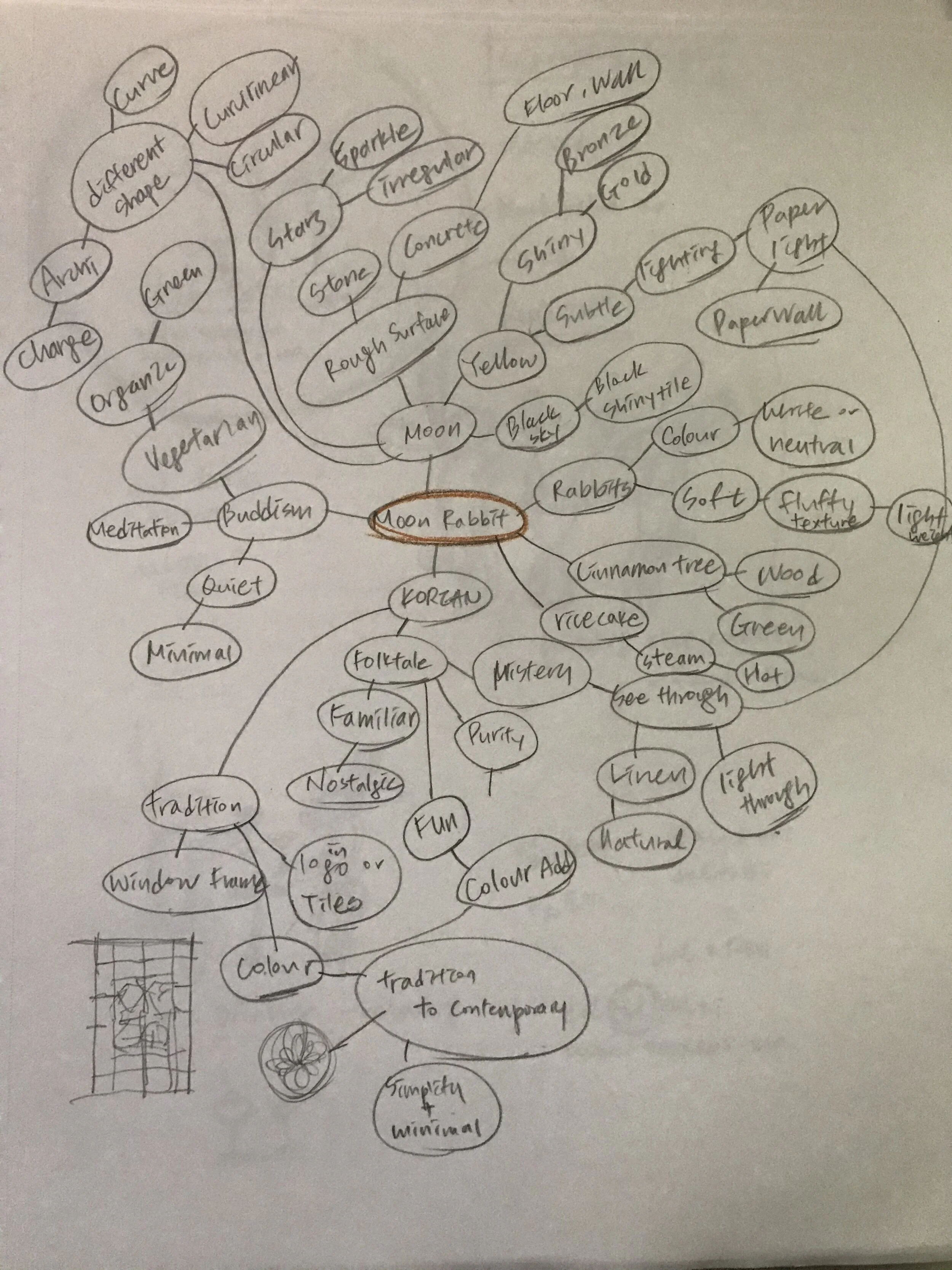 Inspired by moonlight, Daltokki is bathed in warm light. The yellow glow is cast upon ornate wooden features, borrowed from traditional Korean window frames. The legend of the moon rabbit is referenced in traditional art prints and lunar shapes, bringing the folktale to life.