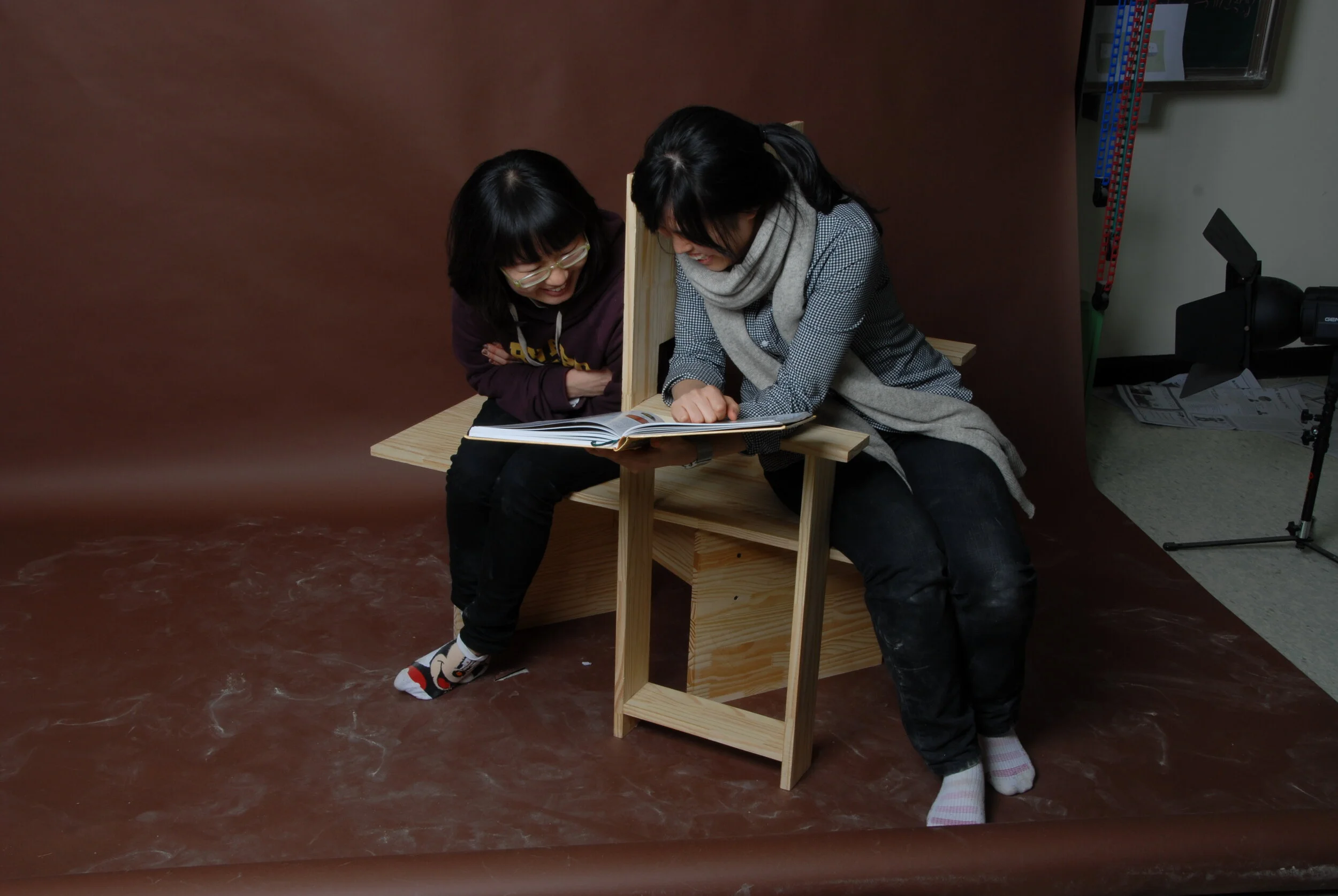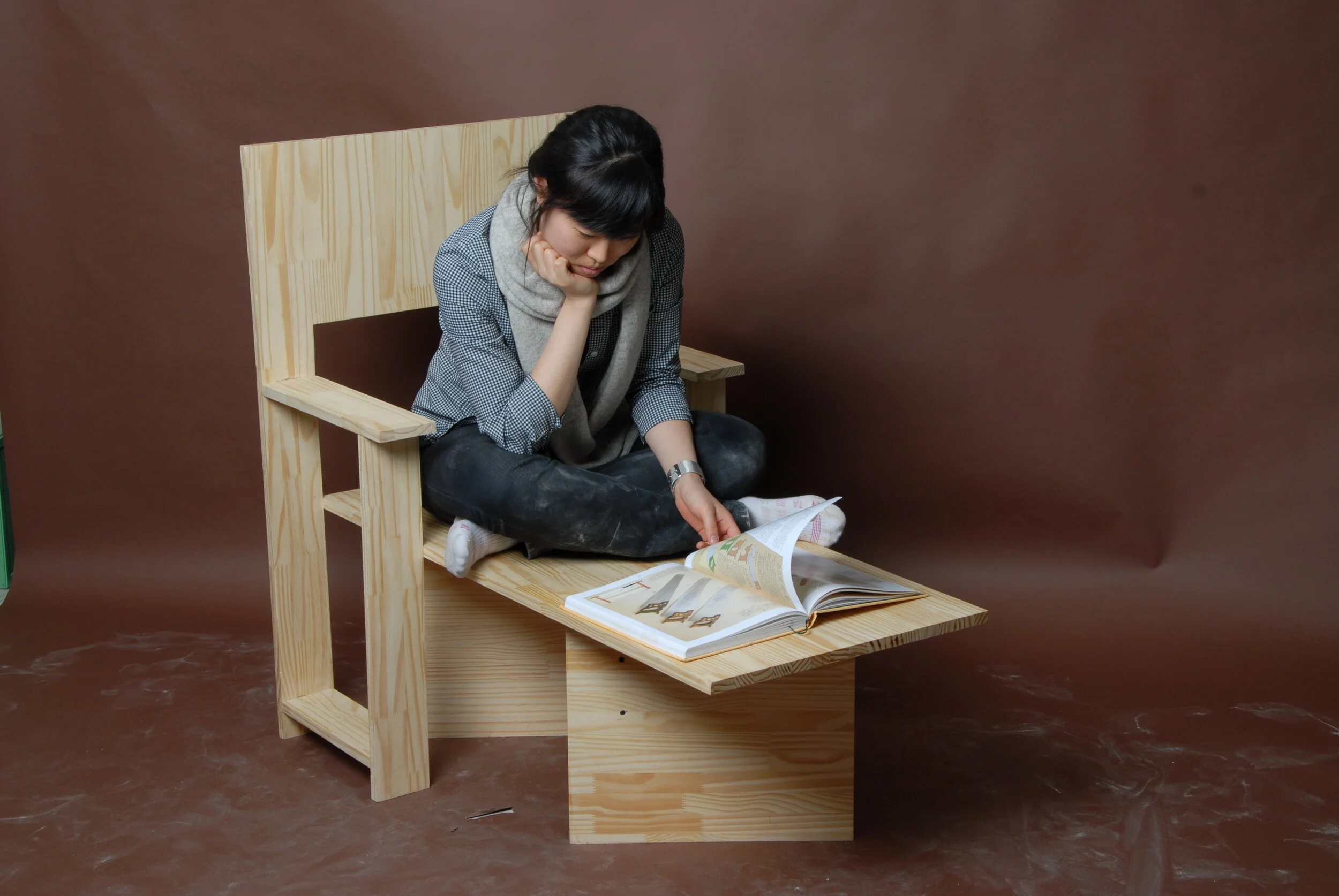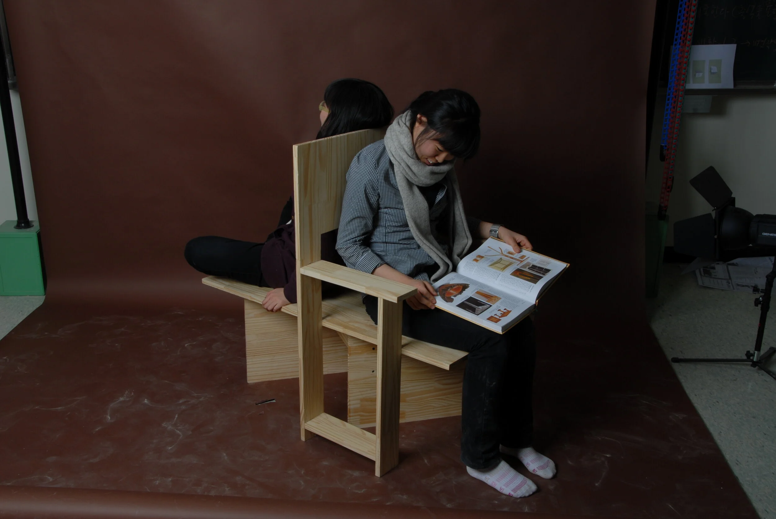 When you sit alone, you can position yourself according to the movement of your back. You can sit with your legs straight or in a seated position. But this chair isn’t only to be used by one’s self. When another person is seated on the opposite side, each is sitting independently, but they share the same backrest. Turn your head over your shoulder to talk to each other. Or push the back to the side so that you two can sit together in a chair without the armrest. Though it is a rigid form without curves, we are warm enough together.