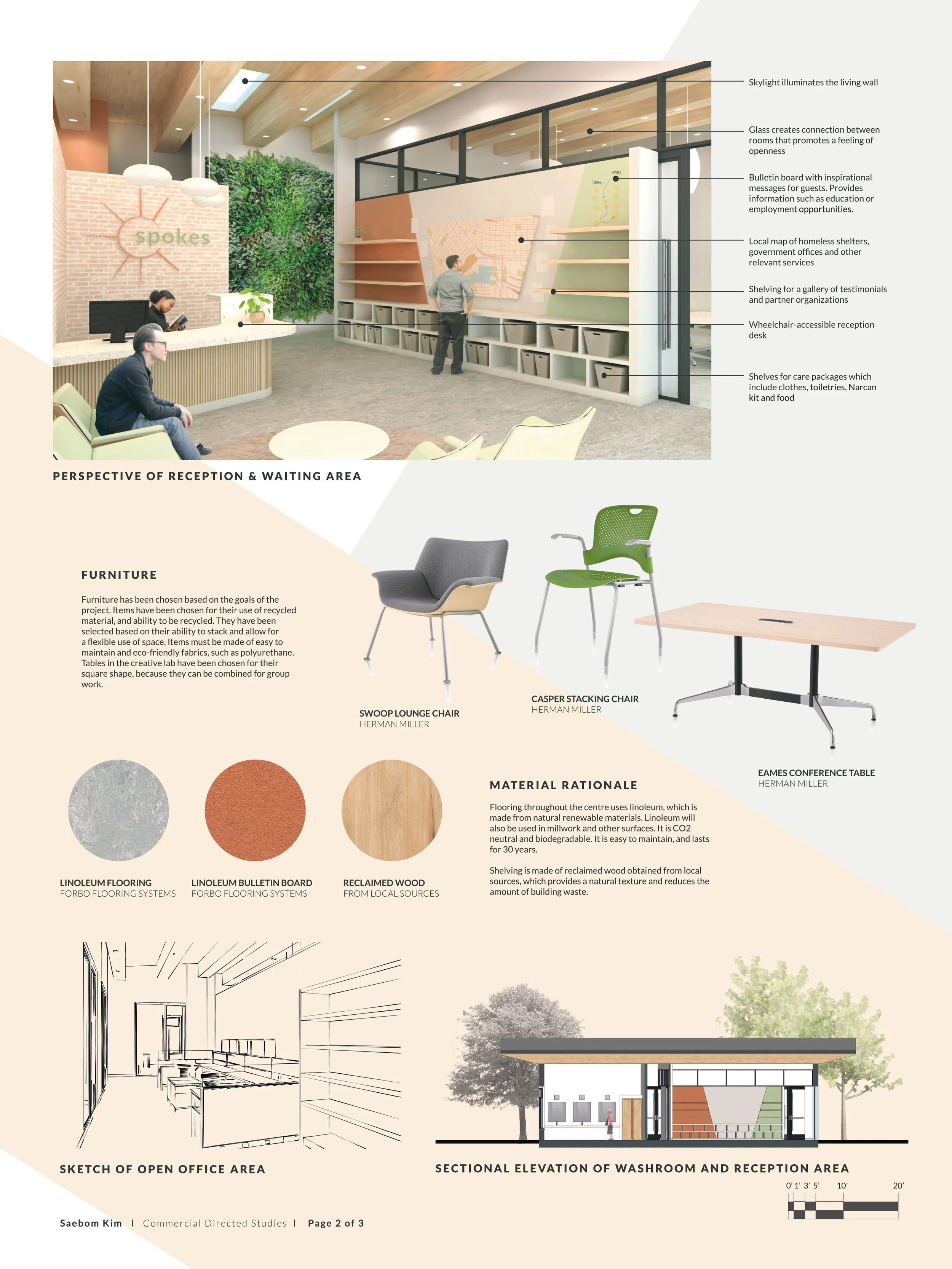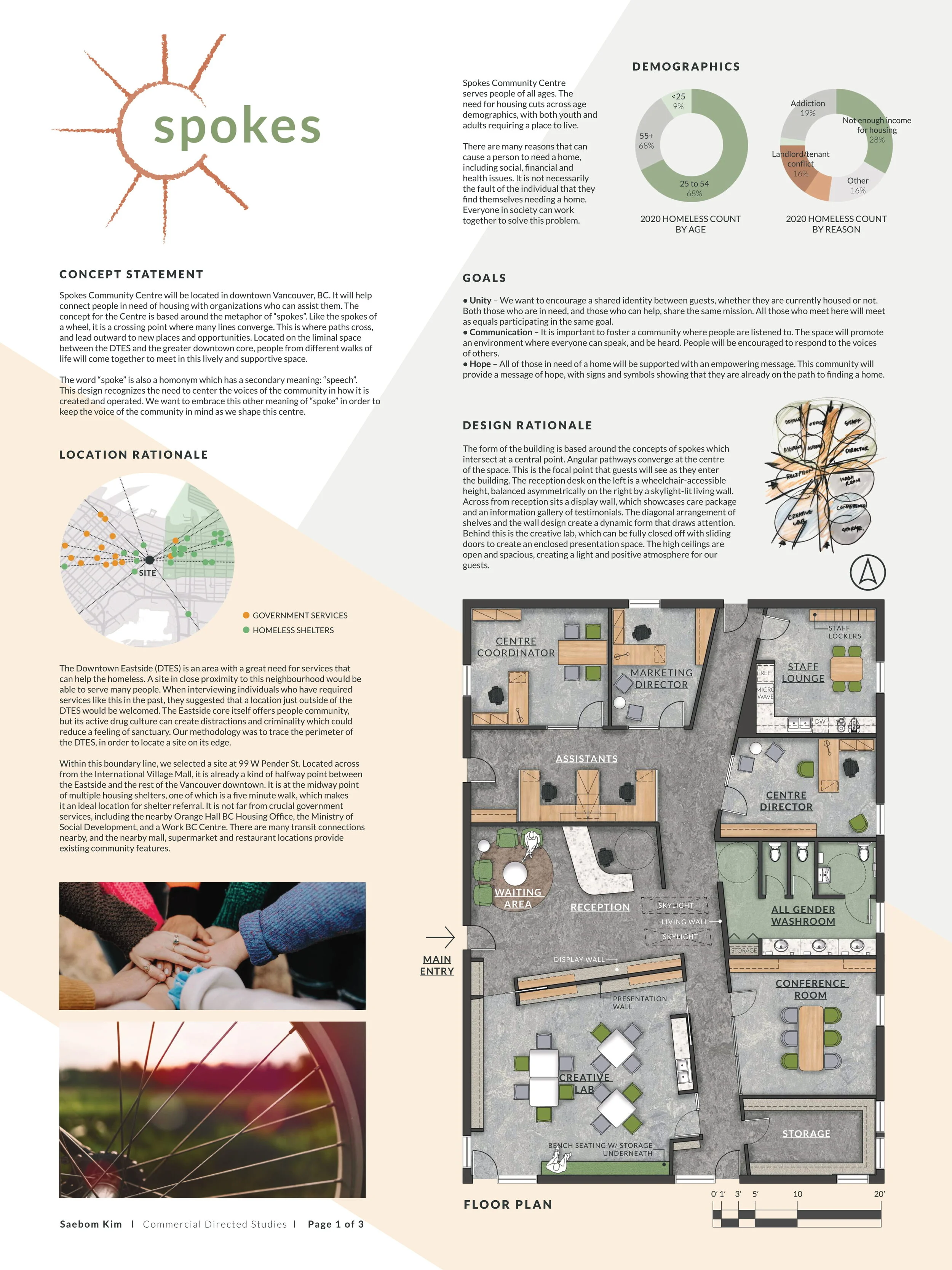 Spokes Community Centre will be located in downtown Vancouver, BC. It will help connect people in need of housing with organizations who can assist them. The concept for the Centre is based around the metaphor of “spokes”. Like the spokes of a wheel, it is a crossing point where many lines converge. This is where paths cross, and lead outward to new places and opportunities. Located on the liminal space between the DTES and the greater downtown core, people from different walks of life will come together to meet in this lively and supportive space.